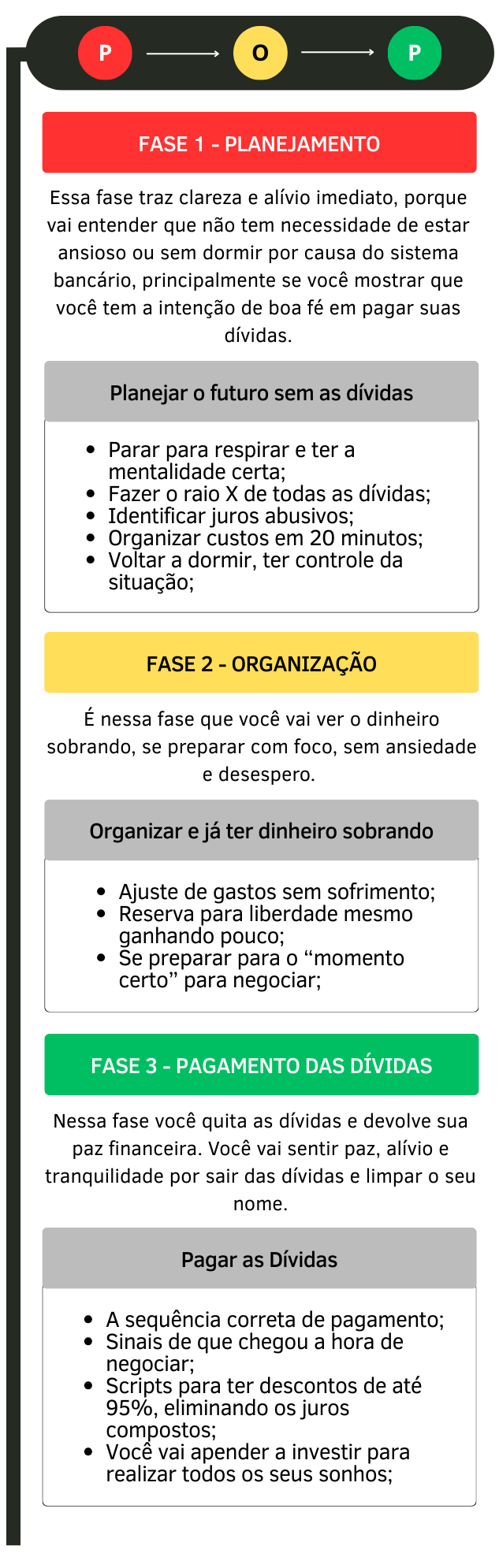 Você aprende a negociar dívidas, entender as regras dos bancos, organizar a vida financeira, criar renda extra e usar o dinheiro com consciência, são aulas e scripts simples para já ter resultados.